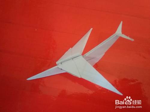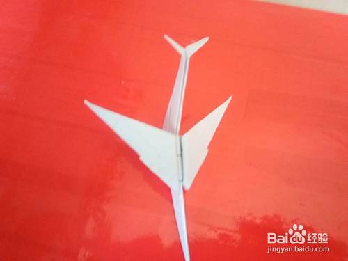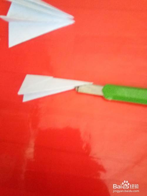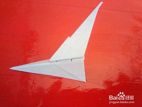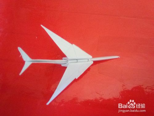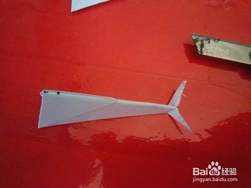 将一个部件沿着中线裁出一部分,如图所示,合拢后,将剪开部分向上翻折得到飞机的尾巴;