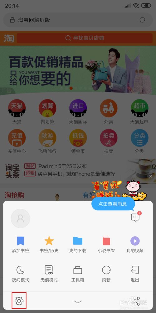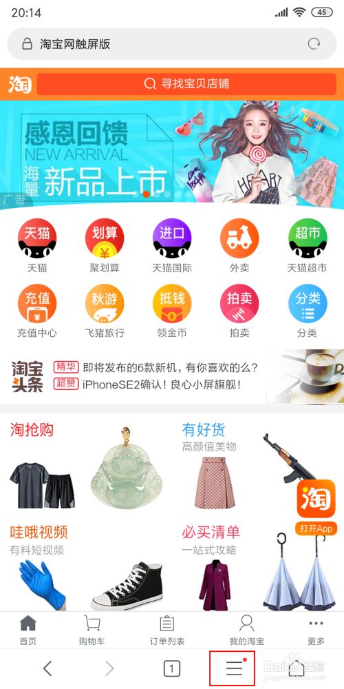 打开后可以看到默认的就是手机触屏版的淘宝。我们先来点击底部浏览器的【菜单栏】。