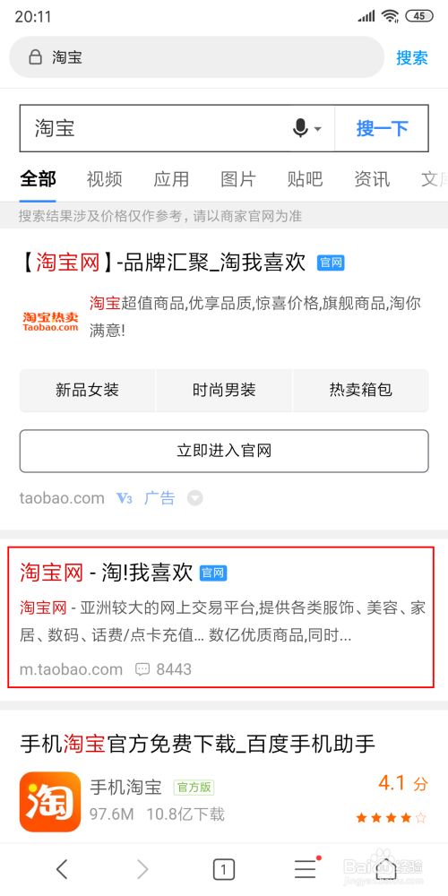 打开手机浏览器,在默认搜索框中搜索【淘宝】,找到官方网站后,点击打开。