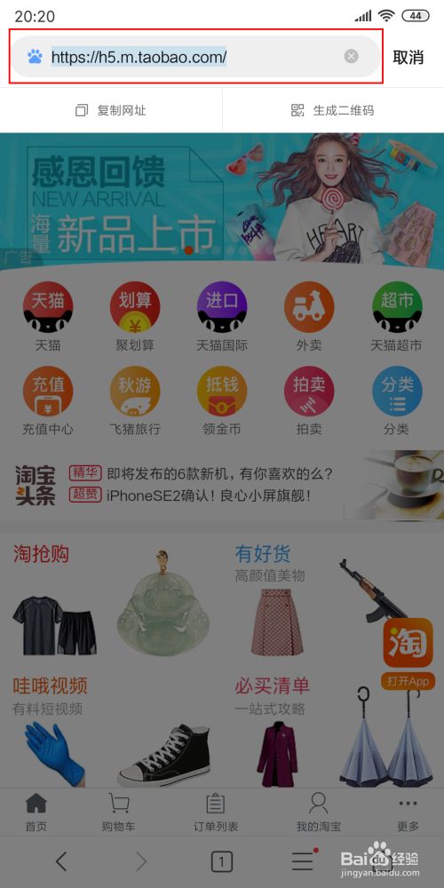 我们点击浏览器顶部的搜索栏,发现触屏版的网址是【https://h5.m.taobao.com】。分析网址可以看到h5和m都是代表手机网页的意思哦,所以打开的肯定还是手机版的页面了。这时候我们就要修改下网址咯。