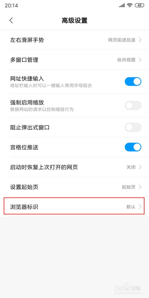 进入到高级设置后可以看到最后一个【浏览器标识】设置的是【默认】,我们点击打开。