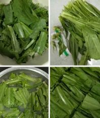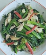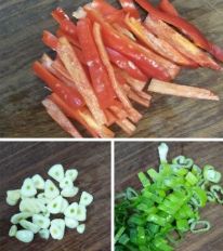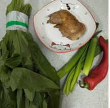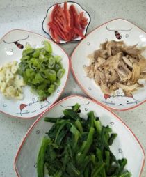 油麦菜1把(200克),自制鸡腿1小个,红尖椒1个,葱适量,还有半头蒜。