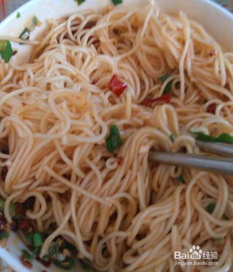 然后把油倒入放过调料的面中,搅拌均匀,一碗美味可口的油泼面就做好了。
