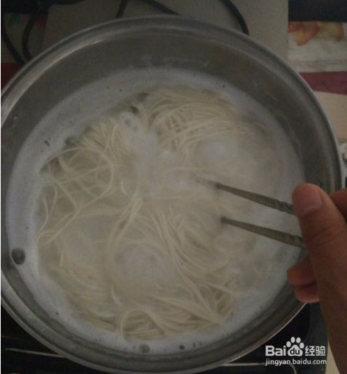 先把金沙河龙须面煮熟,注意的是别煮太长时间,然后捞出来放到碗里。