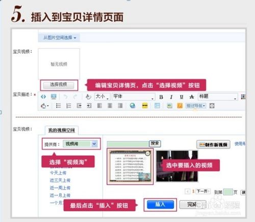 在“宝贝基本信息”的页面上填写完宝贝的其他信息后,找到其中“宝贝视频”的信息,点击“选择视频”的按钮,选中需要插入到页面的宝贝视频,然后再点击蓝色按钮“插入”键,该视频便被安置在了展示宝贝的详情页中了。最后,选择点击页面底部的“发布”按钮,带有商品视频的宝贝详情页就这样上架啦。
