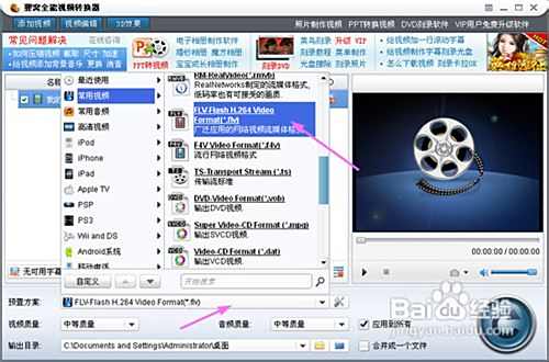 选择输出flv格式。添加水印之后,点击“确定”按钮,然后在主界面下方的“预置方案”右边选择要转换的flv格式,点击弹出的格式栏上选择“常用视频”项。这里还可以转换手机支持的flv转3gp、rmvb转mp4还有mp3机支持的rmvb转mp3等等。如下图所示: