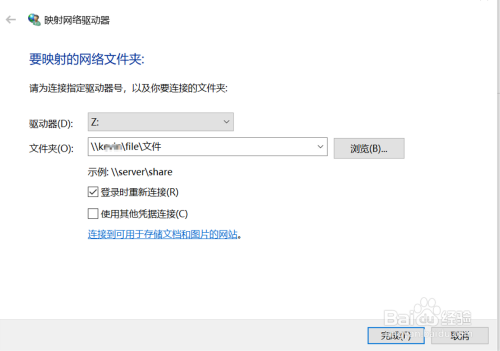 在“文件夹”选项输入网络共享文件夹路径,然后点击“完成”。