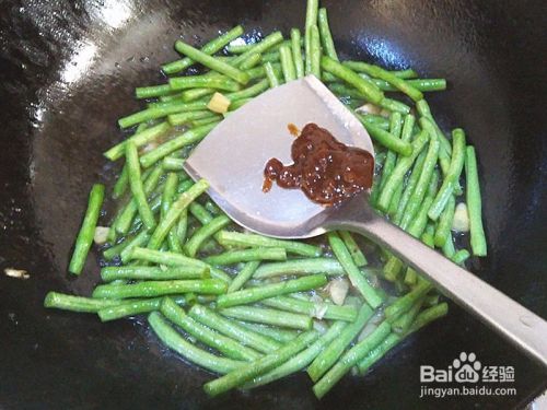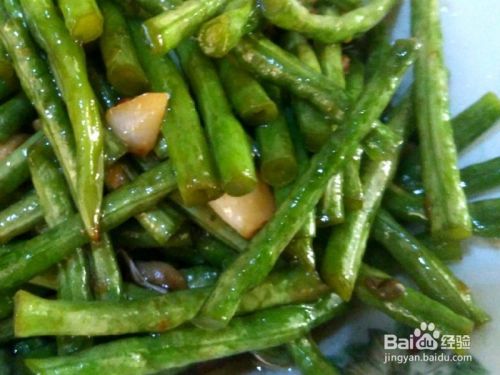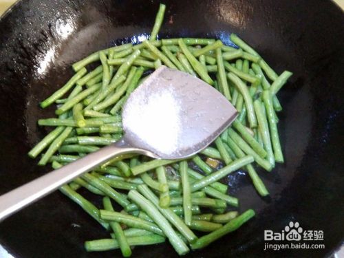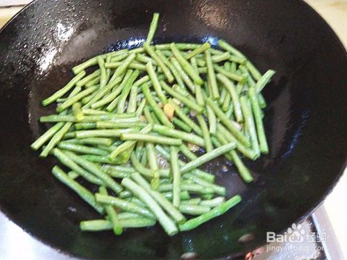 等油达到7层热,也就是手放在油上面感觉到热时,倒入豇豆,加入2g盐翻炒。