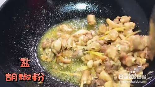油热下入10g姜,五百克鸡肉,炒干水分,倒入20g盐,20g胡椒粉,翻炒均匀,倒入100g啤酒,盖上盖子焖煮30分钟,盛出备用