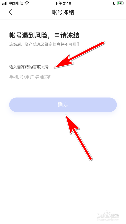 输入需冻结的百度帐号后,点击确定的按钮即可申请冻结帐号。