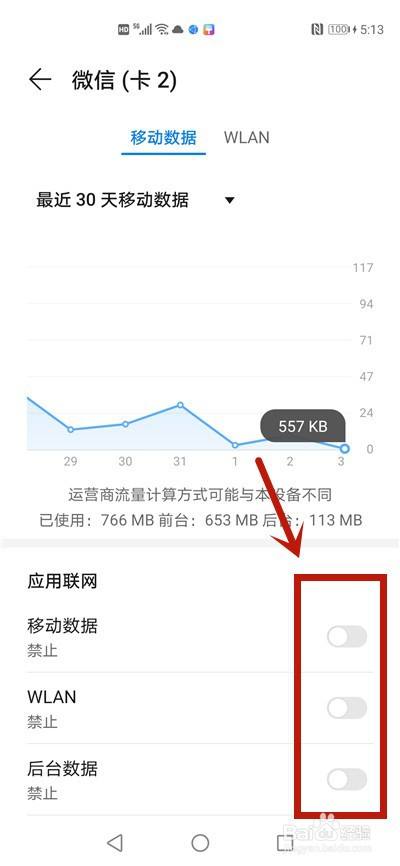然后发现移动数据、WLAN、后台数据按钮都是关闭,这时微信就无法打开,需要将这几个按钮开启,才能正常打开微信。
