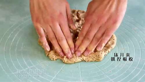7中途将油倒在面团上,抹开来抓捏吸收。