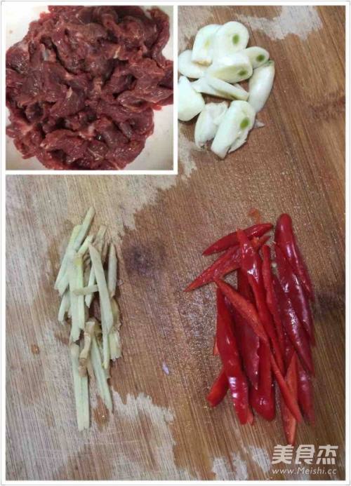 2牛肉放少量淀粉、鸡精、半茶匙盐跟酱油腌制5分钟。姜跟辣椒切丝,蒜切片。