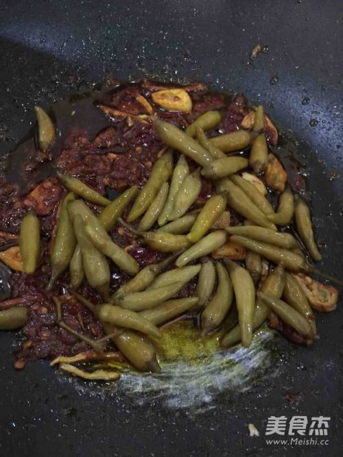 6倒入泡椒,泡椒水留在碗里待用,翻炒两三下。