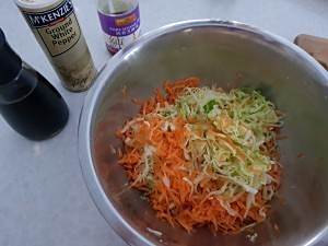 把挤好的卷心菜丝和胡萝卜丝混合好,放进白胡椒粉,酱油香香油搞拌匀。(不用再加盐)