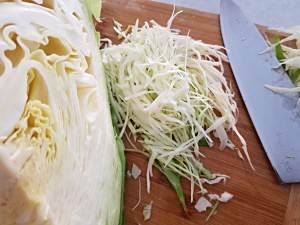 先切把卷心菜切成细小的丝,如图的小丝状态。