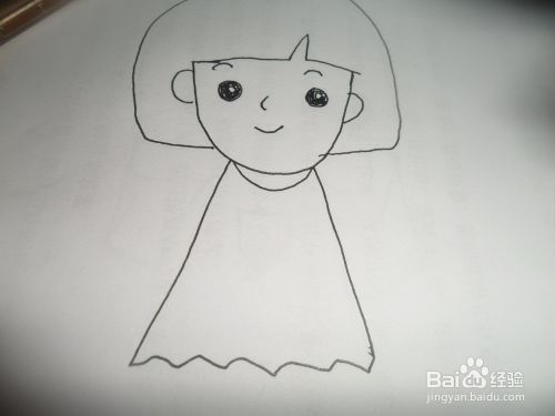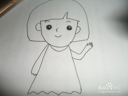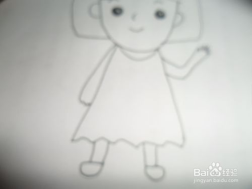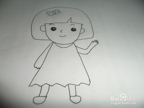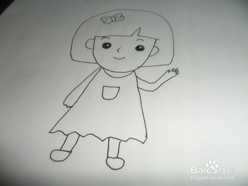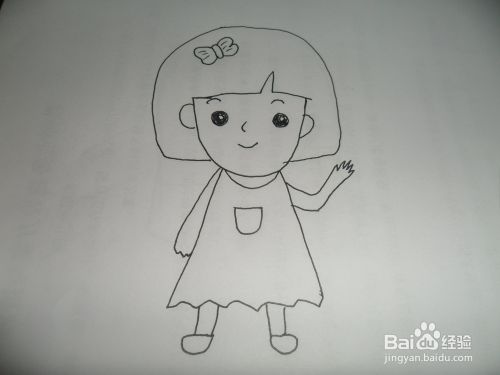 最后在裙子上画上口袋,在头发上装饰上蝴蝶结。一个萌萌好看的小姑娘就画好啦。