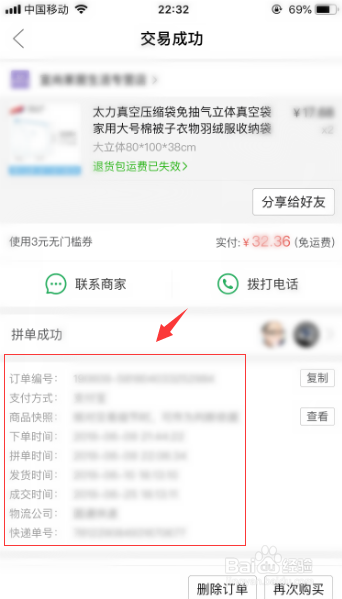 5、点击搜索出来的结果,进入详情页即可完整的查看到,当初购买时的“订单编号”、“物流信息”等等。如果有需要的话可以点击下方的“再次购买”,省去了重新筛选和选择的过程,节省了时间。