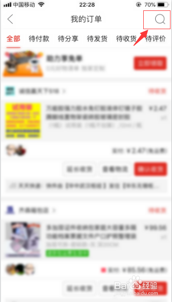 在我的订单列表中,所购买的商品信息会按照由近及远的顺序排列,可以进行翻动查询,也可以直接点击右上角的“搜索框”,输入指定需要查询的商品名称进行搜索。