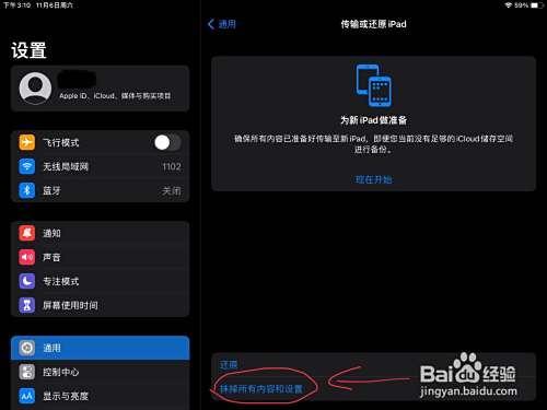 点击通用,下拉到底,点击最下面传送或还原iPad,选抹掉所有内容或设置,有需要备份的可以备份,继续 、等待 、重新激活 、完成操作希望能够帮到你。