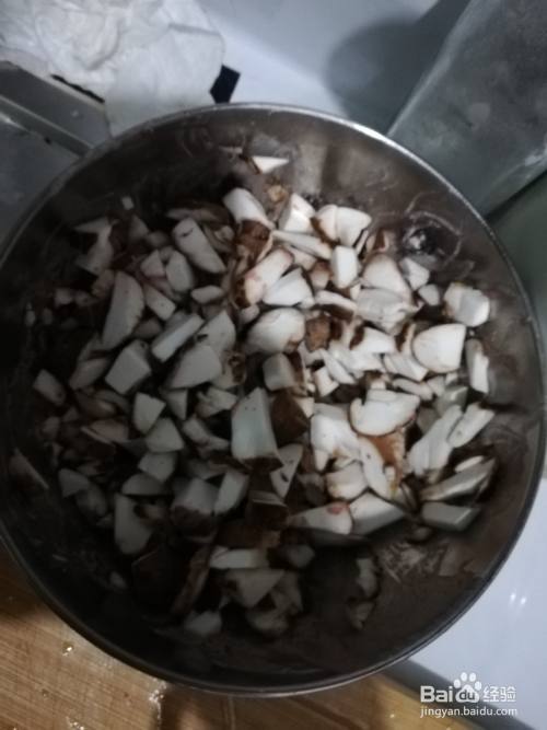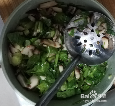 倒入搅拌好的芹菜香菇馅,平摊均匀