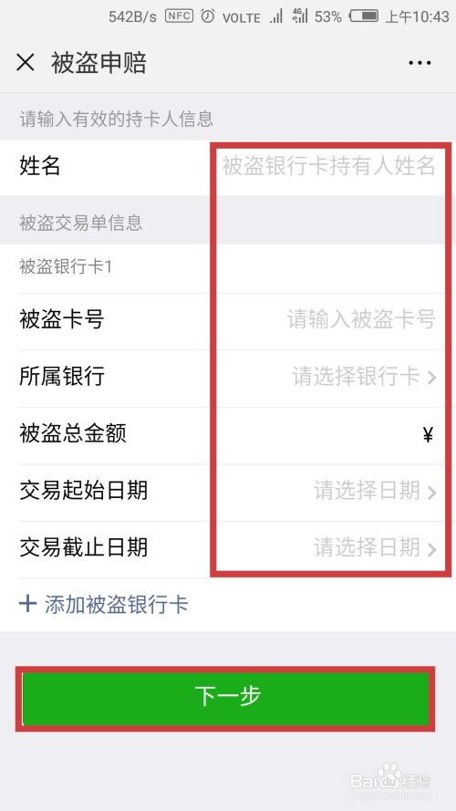 然后填写姓名、被盗金额等信息,点击【下一步】,如图所示。