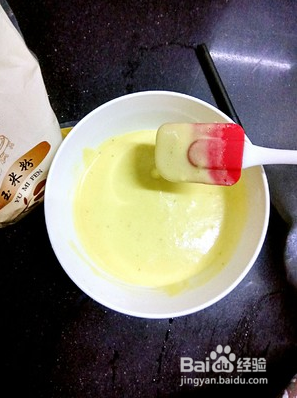 倒入碗里,加玉米粉,酵母,搅匀,静置半个钟,让玉米粉充分吸收水份,就不会吃出粗粗的粗粮感觉
