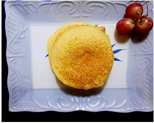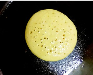 平底锅,小火,用个大点的勺子,舀一勺倒锅中间,自然流动成一个圆饼状,煎到玉米饼开始有小泡泡,就翻面,两面都有点黄黄的就可以啦