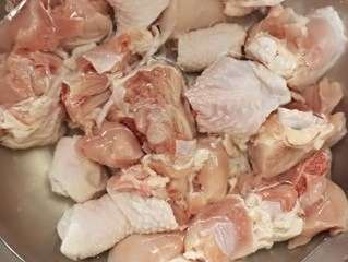 鸡腿改刀成小块。鸡腿清水浸泡,尽可能地去除血水。