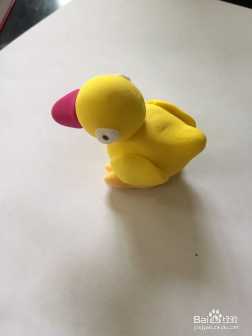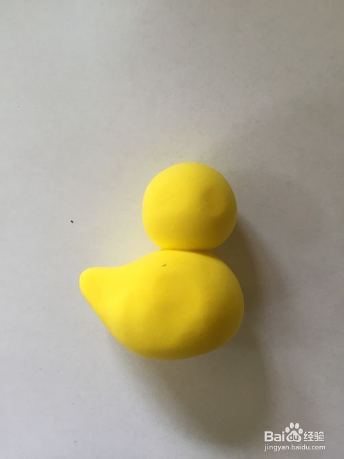 取两个小块黄色,压成椭圆形,作为翅膀,粘粘再小鸭子身体的两侧。作为小黄鸭的翅膀。