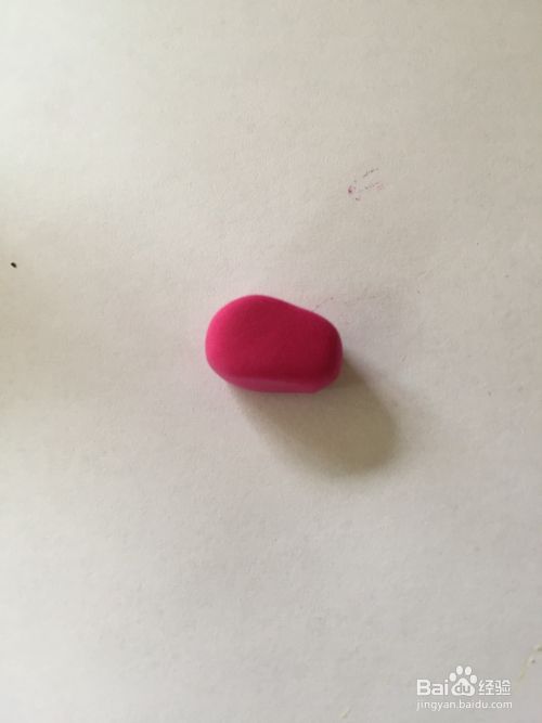 取出红色的超轻粘土,揉搓成圆球,捏扁、一头粗、一头细,如图。粘粘到小黄鸭的头部。