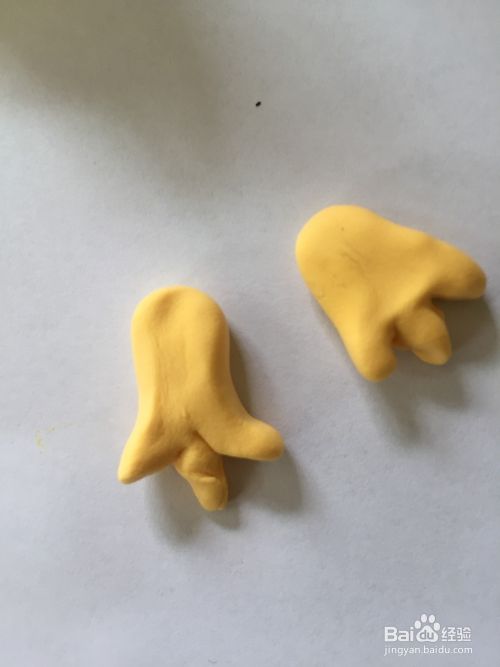 取出两块小的橘黄色,揉捏出椭圆.。用工具刀将一头分割开,如图。将橘黄色的脚丫粘粘到小黄鸭的身体下面。