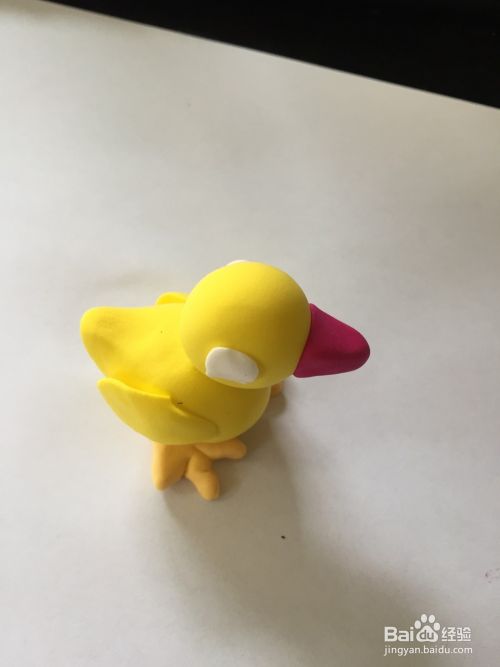 取出白色的超轻粘土,取两点压扁。粘粘到小黄鸭的头部。