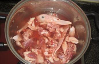 鸭肉凉水放入锅里,加几片姜片煮开并不断把水面的血沫浮物去掉;
