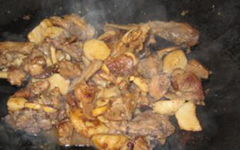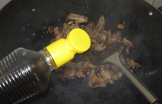 待鸭肉炒干水分,表皮有点焦黄后,依次加入料酒、耗油、生抽翻炒均匀;