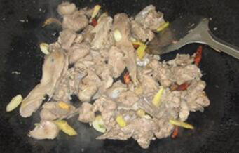 炒锅下油,放入姜蒜片及干辣椒段煸香,倒入鸭肉爆炒均匀;