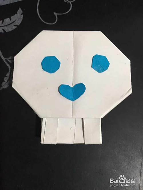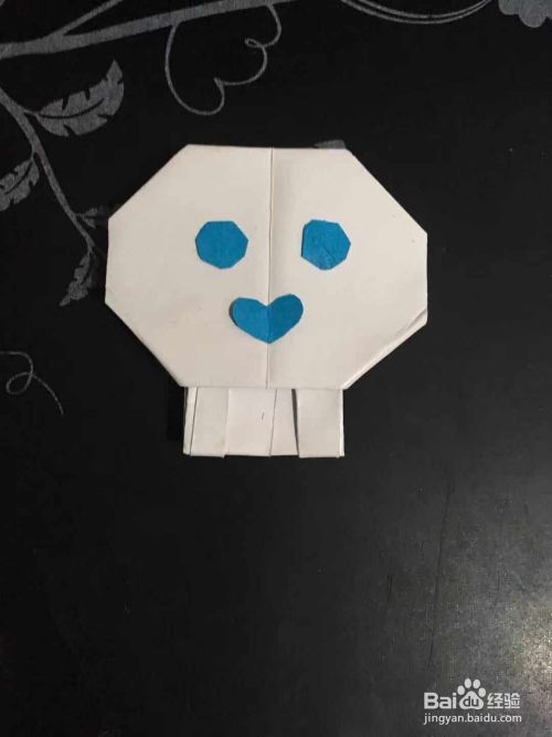 第六步 折叠完之后 再把脖子塞进头部折倒 然后再给小骷髅头贴上两只眼睛和嘴巴 一个小巧玲珑的小骷髅头就折叠完成了