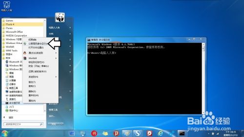 开始→所有程序→附件→右键点击命令提示符→以管理员身份运行。