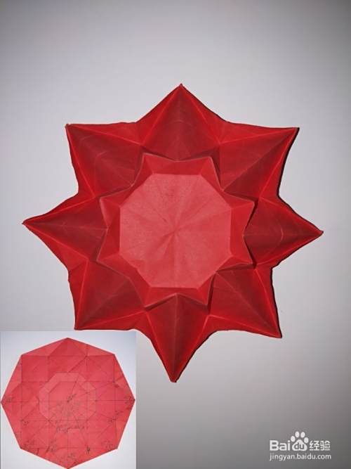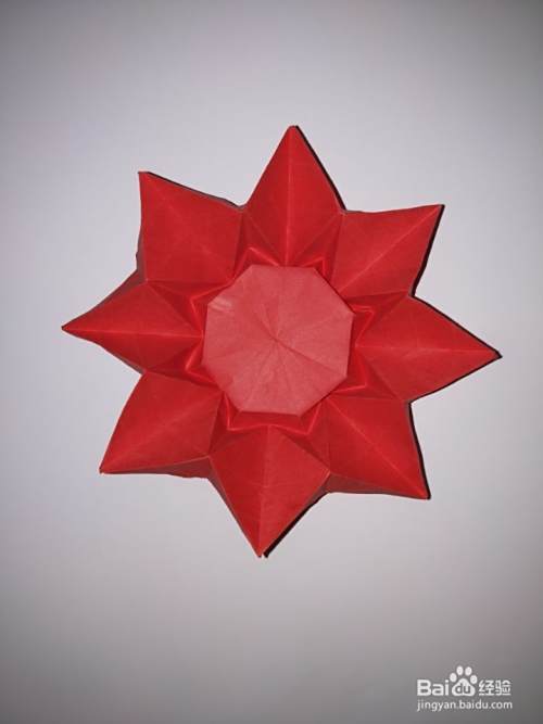 所有线条折好后按图形收缩合拢调整,一个漂亮精致的八瓣花就折好了。下图是八瓣花的另一面。