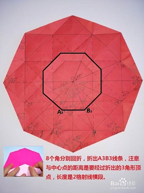 翻面后8个角回折,其与中心的距离是要经过上几步折出的3角形顶点,长度是2格射线横段。8条这样边正好组合成一个正8边形边圈。