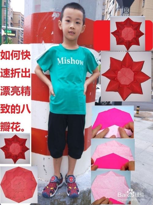 取1张正八边形的彩色纸,若没有可用正方形纸先折出米字形,再把米字形的撇捺与横竖分别对齐折,将中心角折分成16个角,每角22.5°,剪掉多余部分,或把多余部分折进里面。大图是八瓣花的正面。