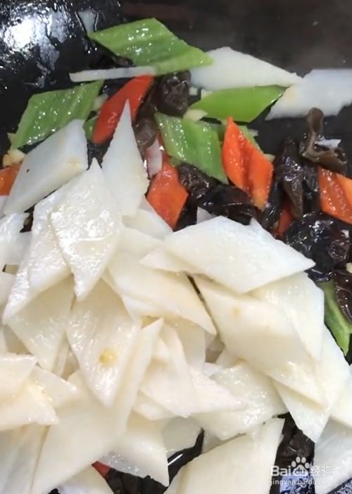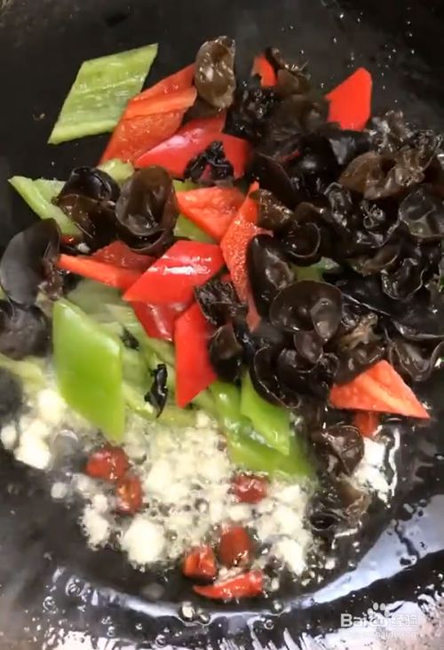 放入青红椒黑木耳,翻炒几下,炒香,下入山药片,继续翻炒。