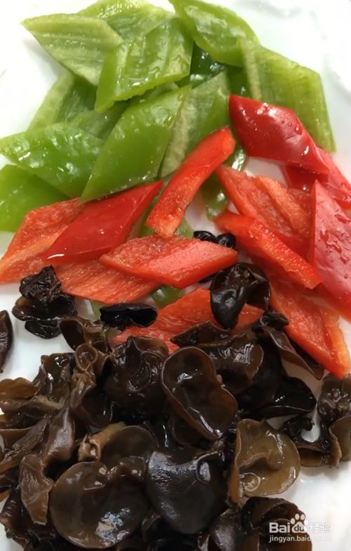 山药去皮,切菱形片。木耳泡好,青红椒切好,备用。