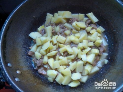 6焖大概10分钟左右,将土豆沥水后倒入锅内翻炒一下,盖下锅盖。