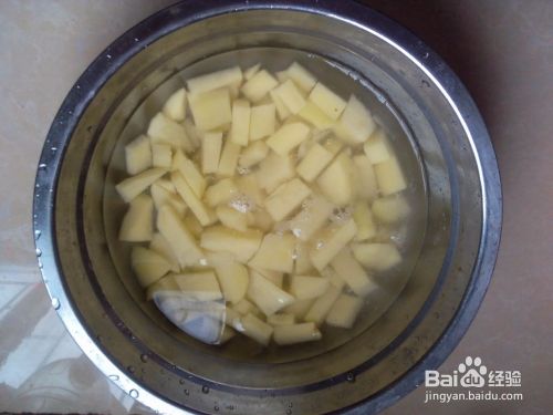 把土豆洗净,削好皮后切成小块,放入水中浸泡。