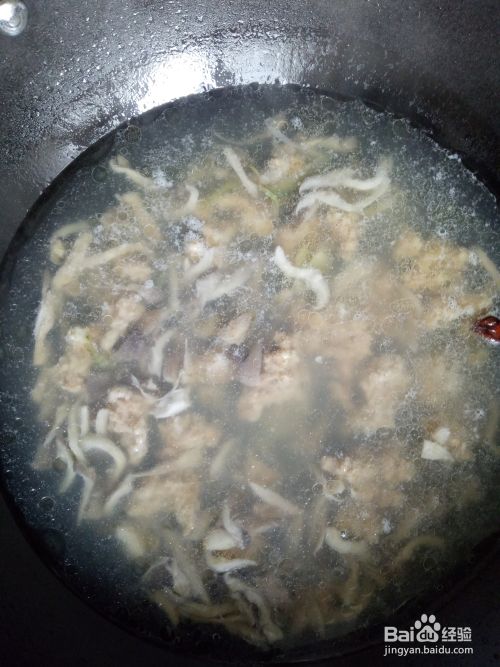 锅中水烧开后,用筷子把肉糊挑出块状依次放入锅中继续大火烧。