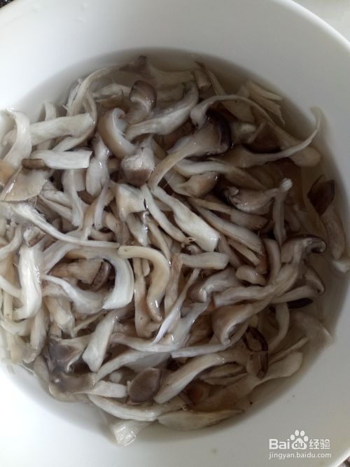 把清洗干净的秀珍菇撕丝放入小碗中,倒入适量的温水浸泡,然后捞出沥干水分。