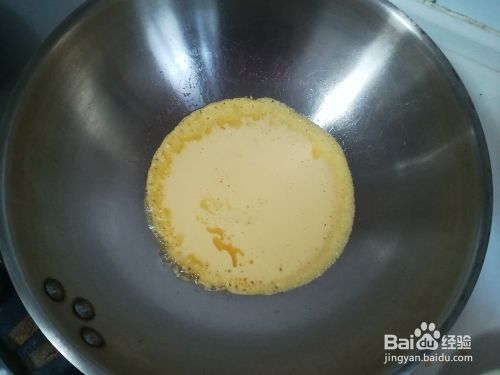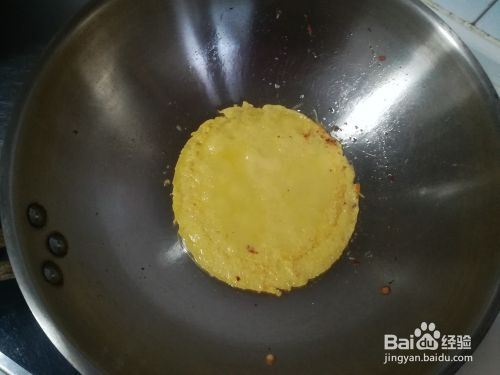 把平锅放火上,给锅内滑一层胡油,锅热后,把面糊倒入锅内,转锅使面糊形成一个圆形面饼,调小火煎制。用胡油比花生油煎出来的面饼香味更加浓郁。