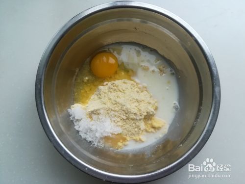 把鸡蛋,牛奶,白糖全部放入玉米面盆里。