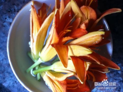 原料处理: 黄花菜是刚采摘的,上面的雄蕊要摘掉,然后放入水中清洗